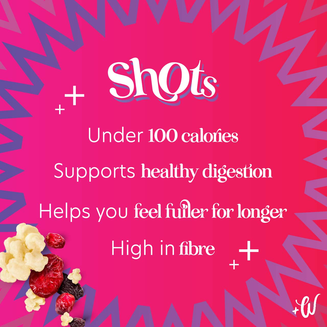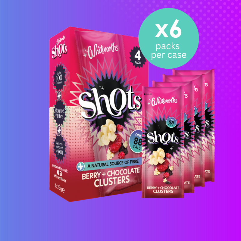 These handy Shots are a great source of gut-friendly fibre and the perfect pick-me-up. Indulge guilt-free with our SHOTS Berries and Chocolate Clusters, packed with flavour and only 88 calories.